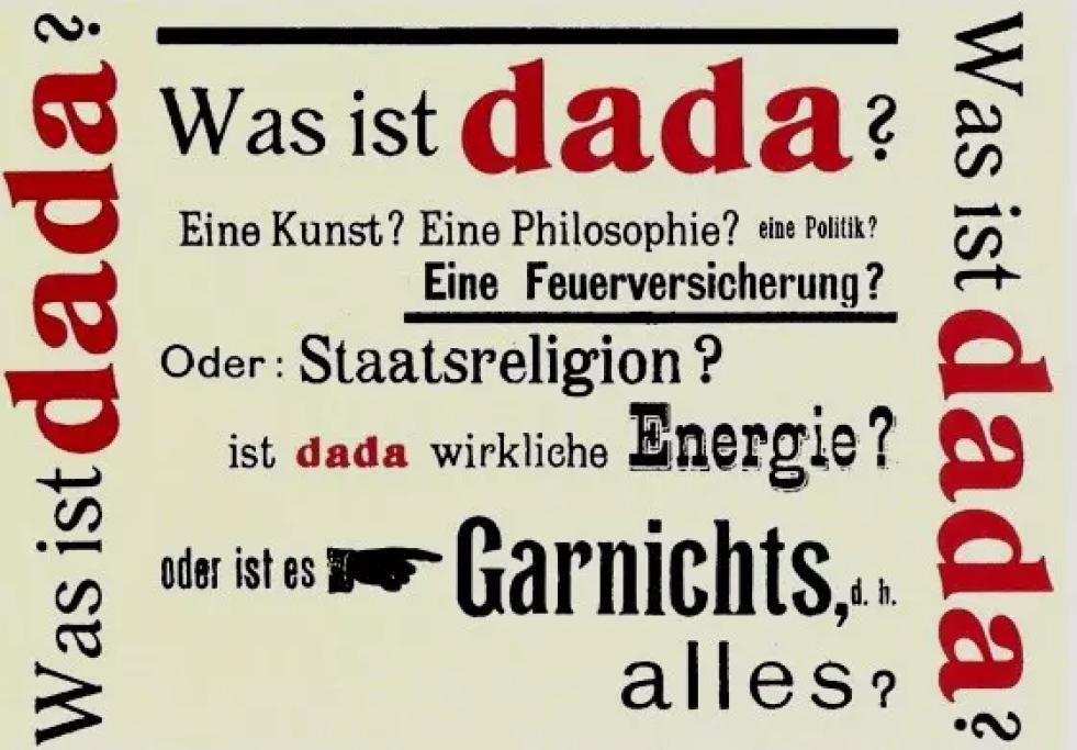 Opprinnelig er Dada et ord som kan bety mange forskjellige ting i forskjellige språk men for kunstnere det som var viktig var at Dada kunne bli alt eller ingenting. Det betyr at kunsten kunne bli det som du som kunstner ønsket kunst å bli.